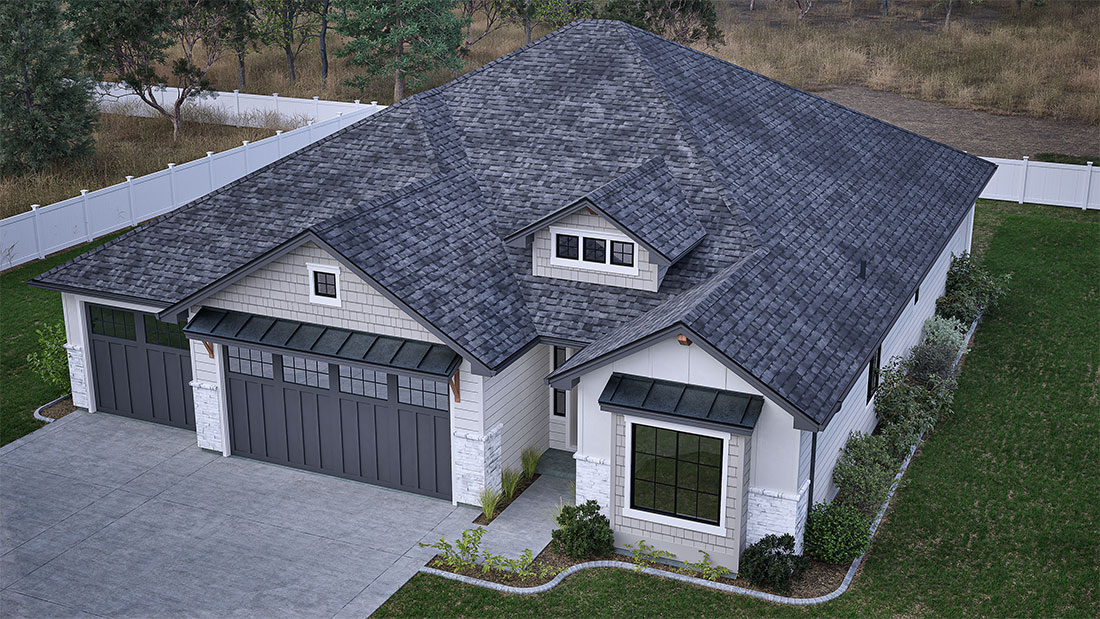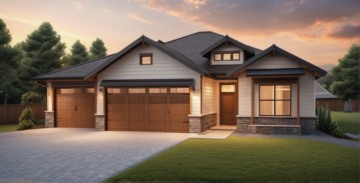 This inviting cottage-style home combines modern amenities with rustic charm. The exterior features a combination of light stonework and shingle siding, accented by dark, sophisticated garage doors and window trim. Its symmetrical design and gable roof lines add classic appeal, while large windows flood the interior with natural light. A welcoming front porch and well-manicured landscaping enhance the curb appeal. Ideal for modern families, this home offers a balance of functionality and style with a cozy, timeless feel.